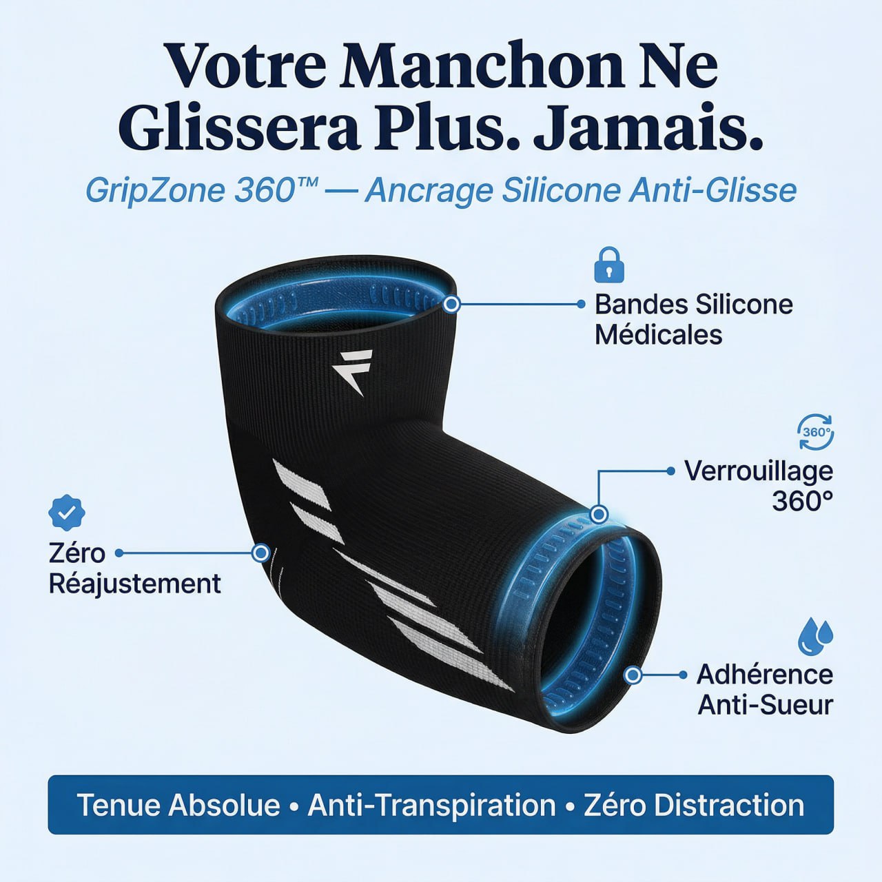 Deux bandes antidérapantes en silicone de qualité médicale forment un anneau continu à 360° autour des bords supérieur et inférieur du manchon. Pas une seule bande. Pas de frottement du tissu. Un verrouillage circonférentiel complet qui répartit la force d'adhérence de manière uniforme sur tout votre bras.