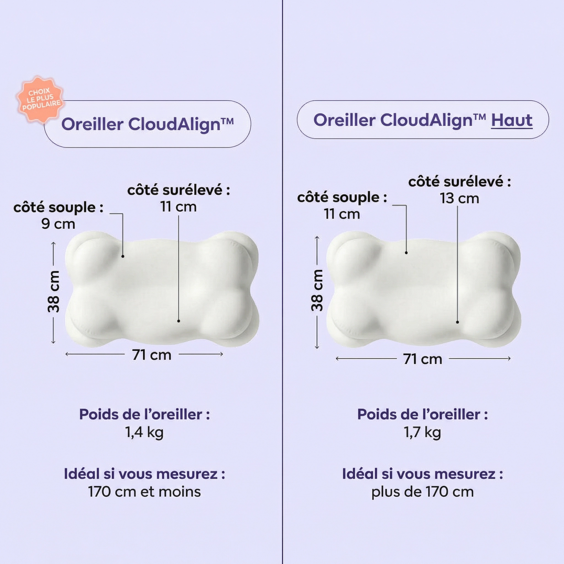 L'oreiller CloudAlign possède deux côtés avec des hauteurs différentes. Le côté Lift (environ 4,3 pouces) offre plus de soutien pour les dormeurs latéraux et sur le dos. Le côté Soft (environ 3,5 pouces) est idéal pour les dormeurs sur le ventre ou ceux qui préfèrent un profil plus bas. Il suffit de retourner l'oreiller pour trouver votre hauteur idéale.