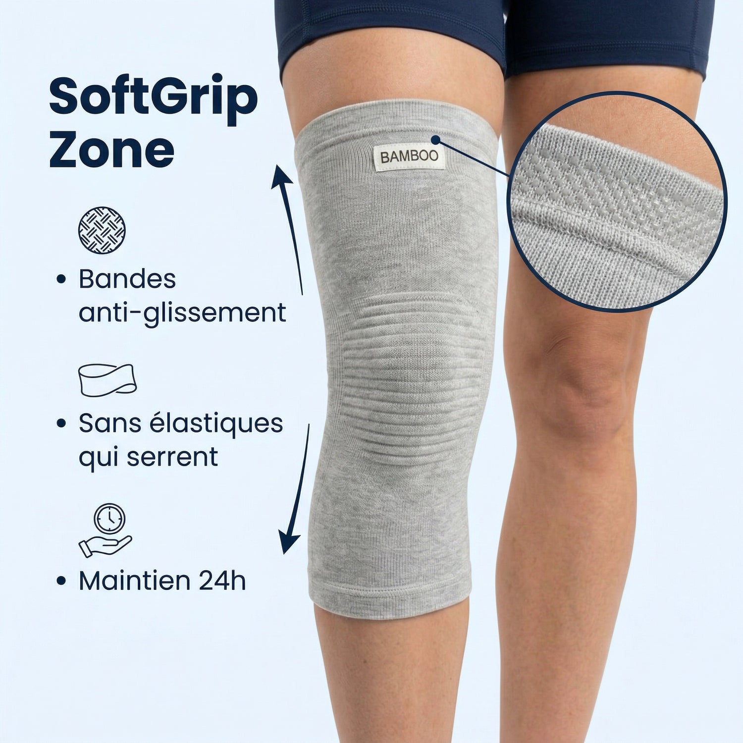 • La zone SoftGrip utilise des fibres de bambou haute densité pour offrir une adhérence naturelle. Pas d'élastiques qui entravent la circulation sanguine.