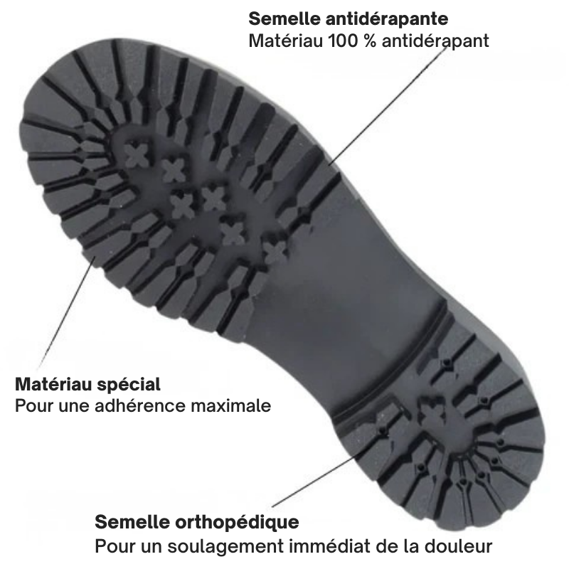 Les chaussures d'hiver traditionnelles ne te protègent pas contre le verglas et la glace. C'est pourquoi nous avons équipé nos bottes d'hiver d'une semelle orthopédique particulièrement antidérapante.